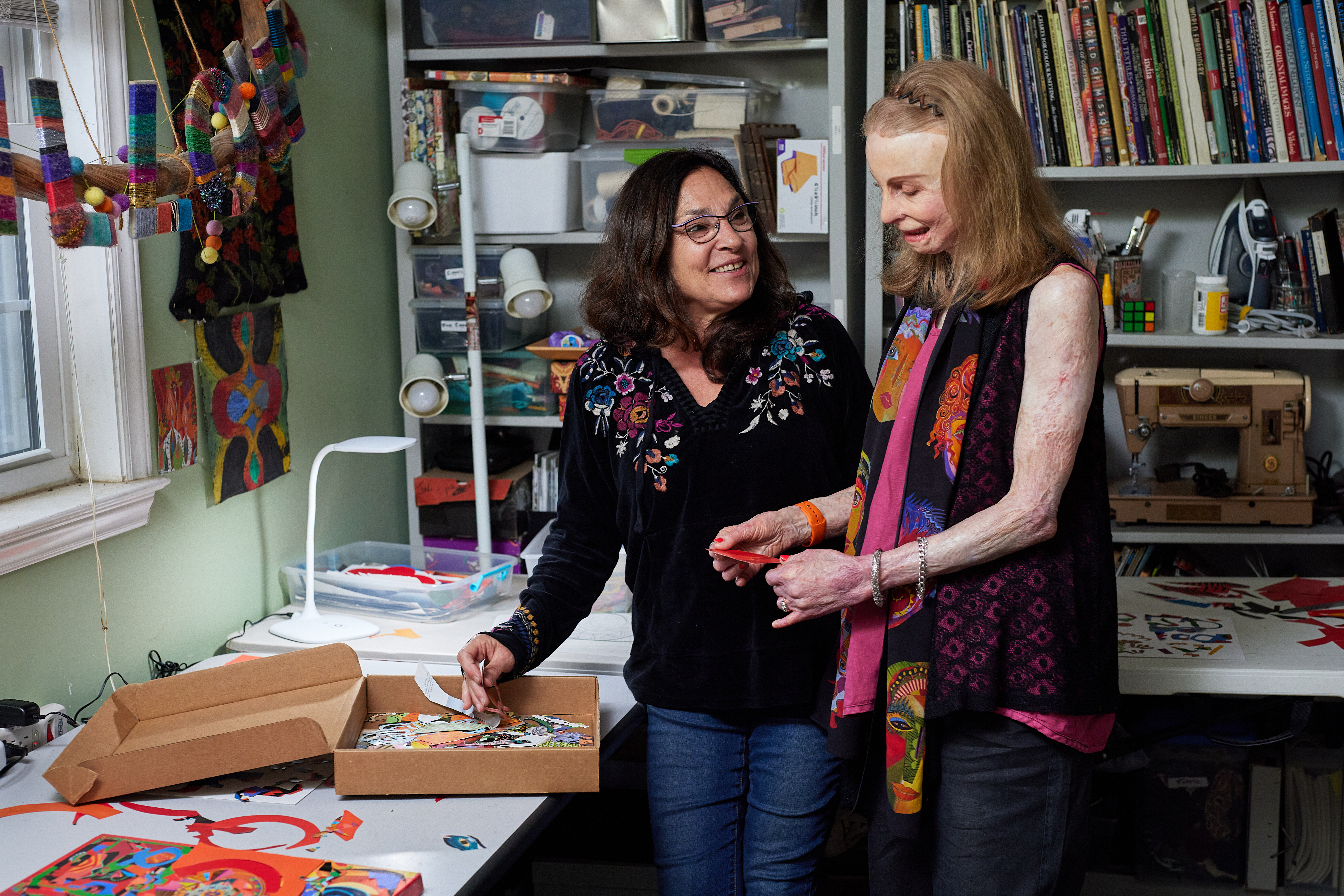 Charlene Pell pictured admiring the exquisite silk scarf artist Judi Magier created with the mosaic of faces. – photo Joey Seawell